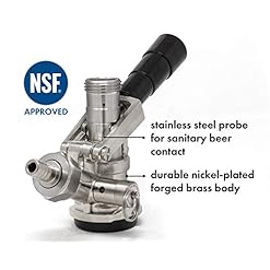 NSF approved keg coupler features a durable nickel-plated forged brass body with a sanitary stainless steel probe