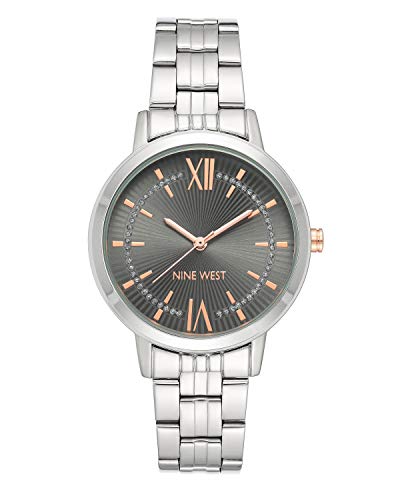 Mineral crystal lens Grey textured dial with rose gold-tone hands and markers; outer ring set with silver-tone glitter Silver-tone adjustable link bracelet; fold over clasp with double push-button safety