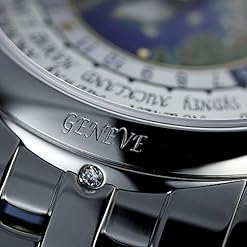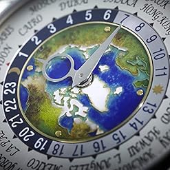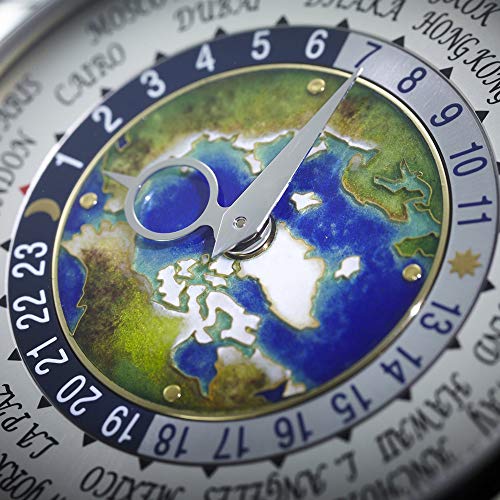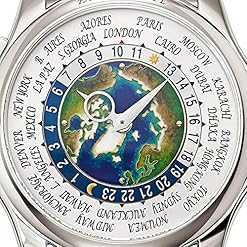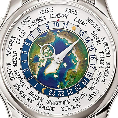 5131/1P – Complications Self-winding The new version of the famous Patek Philippe World Time watch evokes dreams of traveling in style. The center of its dial depicts the world in cloisonné enamel – for the first time from the perspective of the North Pole. It is an unusual view with depth and realism created by the artist with numerous coatings of different enamel paint colors. The platinum case and bracelet pay homage to the Far North, cloaking it with a silvery sheen. World Time. 24-hour and day/night indication for the 24 time zones. Cloisonné enamel center, North Pole. 18K gold dial plate. Platinum bracelet with fold-over clasp. Case: platinum. Sapphire-crystal case back. Water resistant to 30 m. Case diameter: 39.5 mm. Height: 10.61 mm.