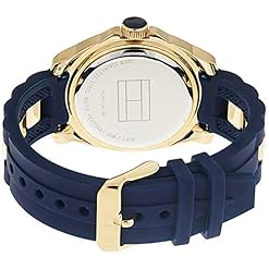 Introducing our two-tone Tommy Hilfiger women’s watch from the casual-sport collection. The gold-plated case with white dial and gold-plated accents provide feminine style, while Arabic numerals and 3-hand movement provide an easy-to-read display. Comfortably chic navy silicone strap and gold-plated links add romantic style with a boyfriend appeal to this versatile timepiece. Additional features include water resistance up to 30 meters, and quartz movement.