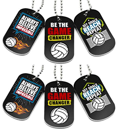 This assorted variety pack of volleyball dogtag necklaces includes 3 different designs (2 pieces of each): Be a Game Changer, Believe in the Impossible, and Set Goals.